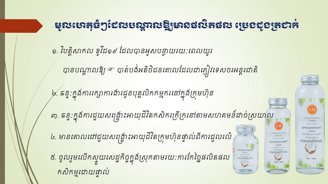 សូមបញ្ជាក់ថា ប្រេងដូងត្រជាក់ LM ផលិតនៅក្នុងខេត្តសៀមរាប ដោយក្រុមហ៊ុន លឹម លីម៉ា ខ្មែរ អង្គរ ហ្វ៊ូត ឯ.ក. ហើយ បច្ចុប្បន្ននេះ កំពុងមានសក្ដានុពលជាអាទិភាព ខ្លាំងក្នុងស្រុកខ្មែរ ដែលមានអ្នកតំណាងចែកចាយនៅទូទាំង២៥ ខេត្តក្រុងរួចហើយ។
